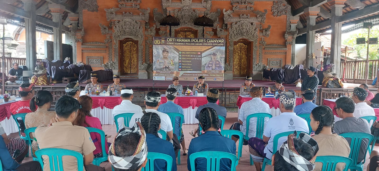 Kegiatan Jumat Curhat Polres Gianyar dihadiri langsung oleh Wakapolres Gianyar Kompol Marzel Doni, S.I.K., M.H. didampingi pejabat utama Polres Gianyar bertempat di Wantilan Pura Desa Ubud.