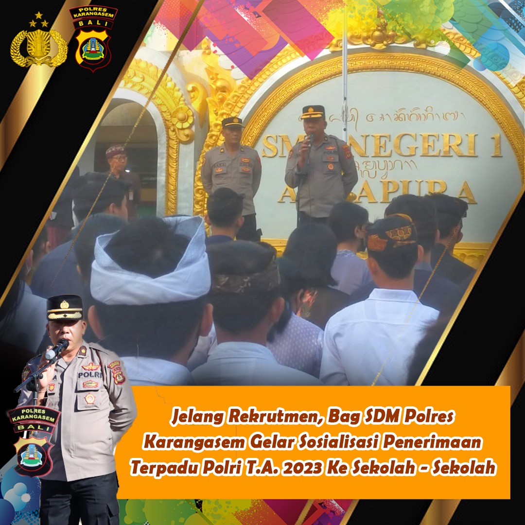 Melalui Bagian Sumber Daya Manusia (Bag SDM), Polres Karangasem melakukan sosialisasi penerimaan Terpadu Polri TA 2023 bertempat di halaman SMA Negeri 1 Amlapura dilaksanakan sosialisasi Rekrutmen Anggota Polri kepada siswa – siswi SMA Negeri 1 Amlapura. Kegiatan dipimpin oleh Kabag SDM Polres Karangasem Kompol I Nyoman Merta Kariana, S.H., M.H. didampingi Kepala Sekolah SMA Negeri 1 Amlapura Drs. I Ketut Marta Ariana S.Pd., M.Pd.