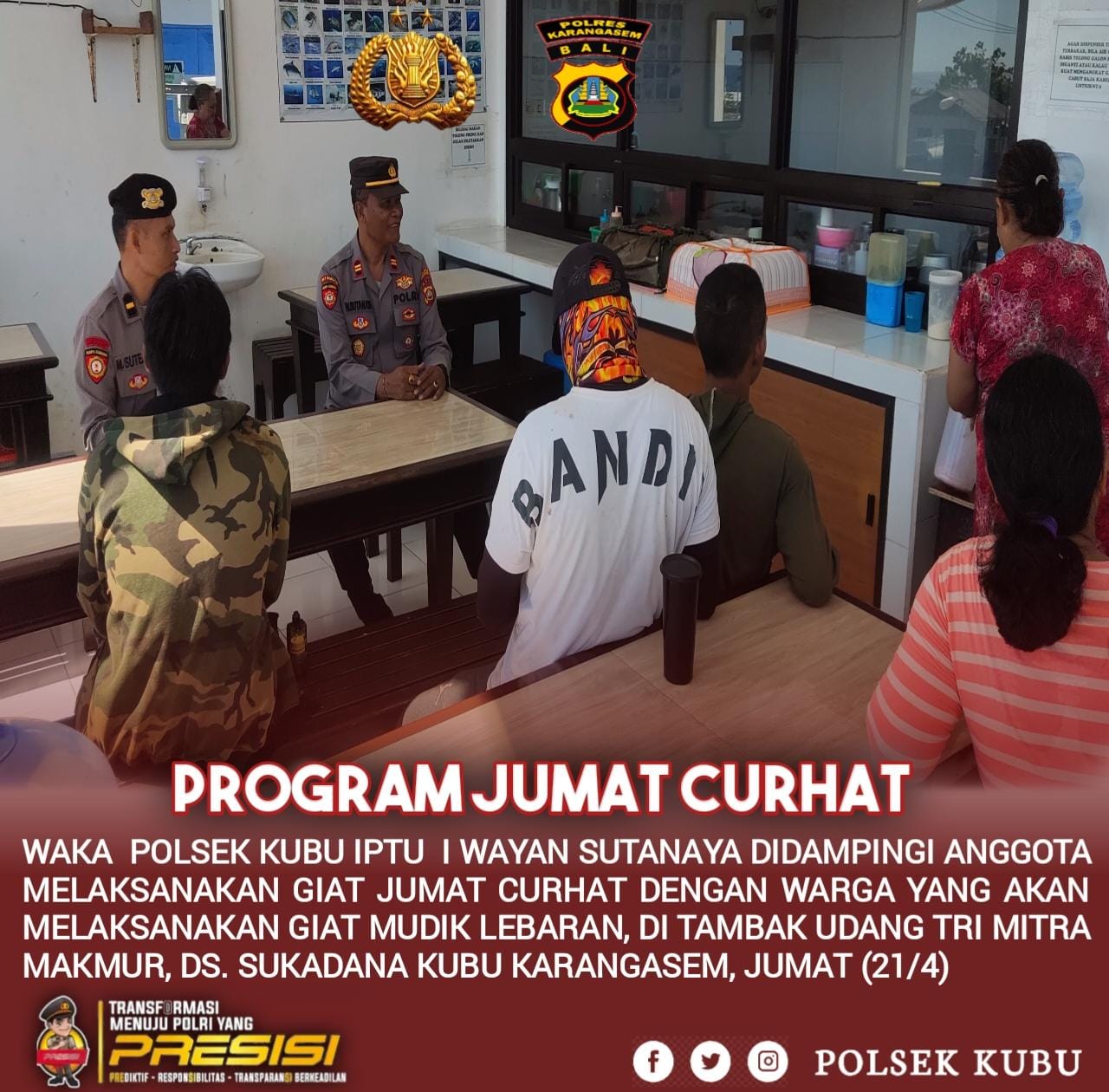 Kali ini, Polsek Kubu menggelar Cumat Curhat dengan Warga yang akan melaksanakan giat mudik yang merupakan karyawan Tambak udang Tri Mitra Makmur bertempat di warung Makan Tambak Udang Tri Mitra Makmur Desa Sukadana, Kubu Karangasem, Jumat ( 21/4).