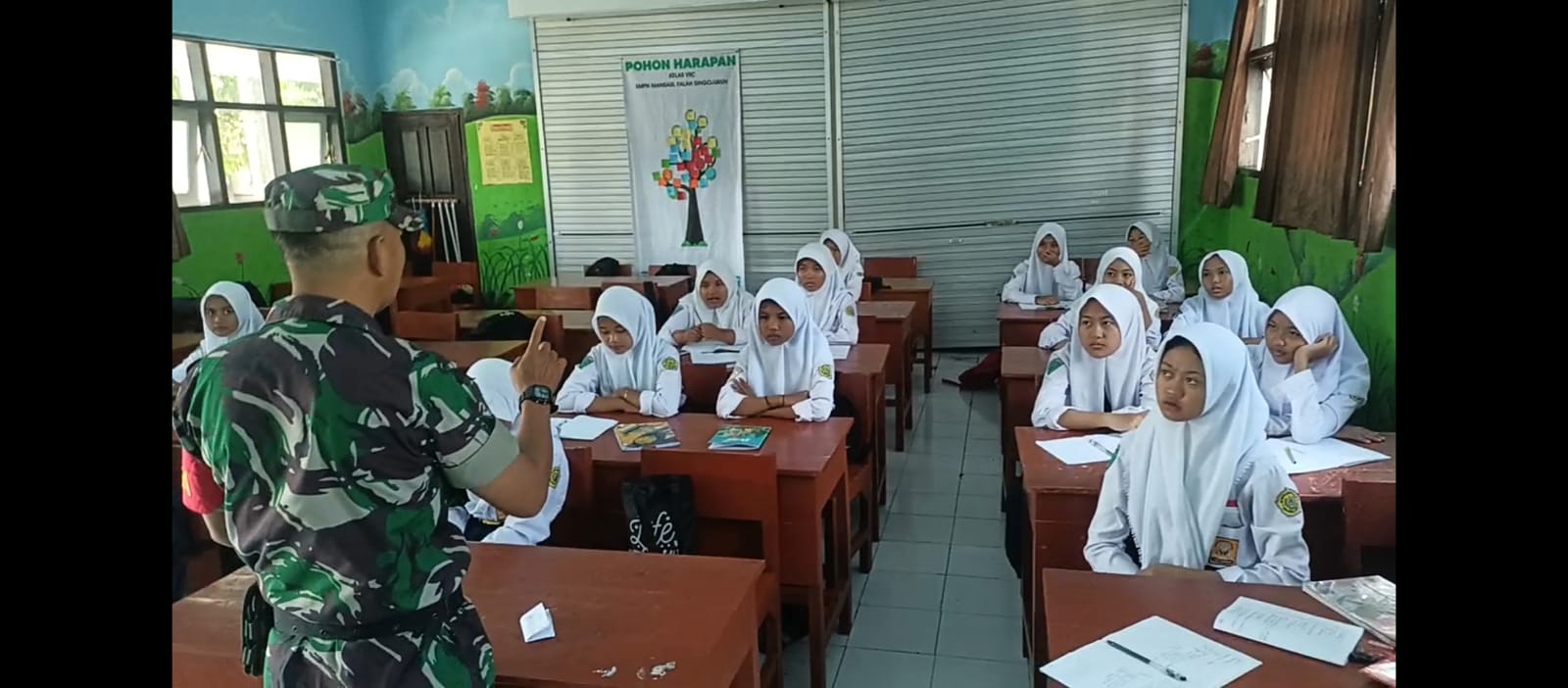 BANYUWANGI, liputanterkini.co.id Saat ini Generasi muda khususnya Pelajar cenderung ogah-ogahan dan malas didalam menjalani pendidikan untuk itu Babinsa Koramil 0825/13 Singojuruh melaksanakan Kegiatan Babinsa Masuk sekolah yang kali ini dilaksanakan di SMP N Manbaul Falah dengan memberikan Materi Wasbang dan kepemimpinan. (24-05-2023).