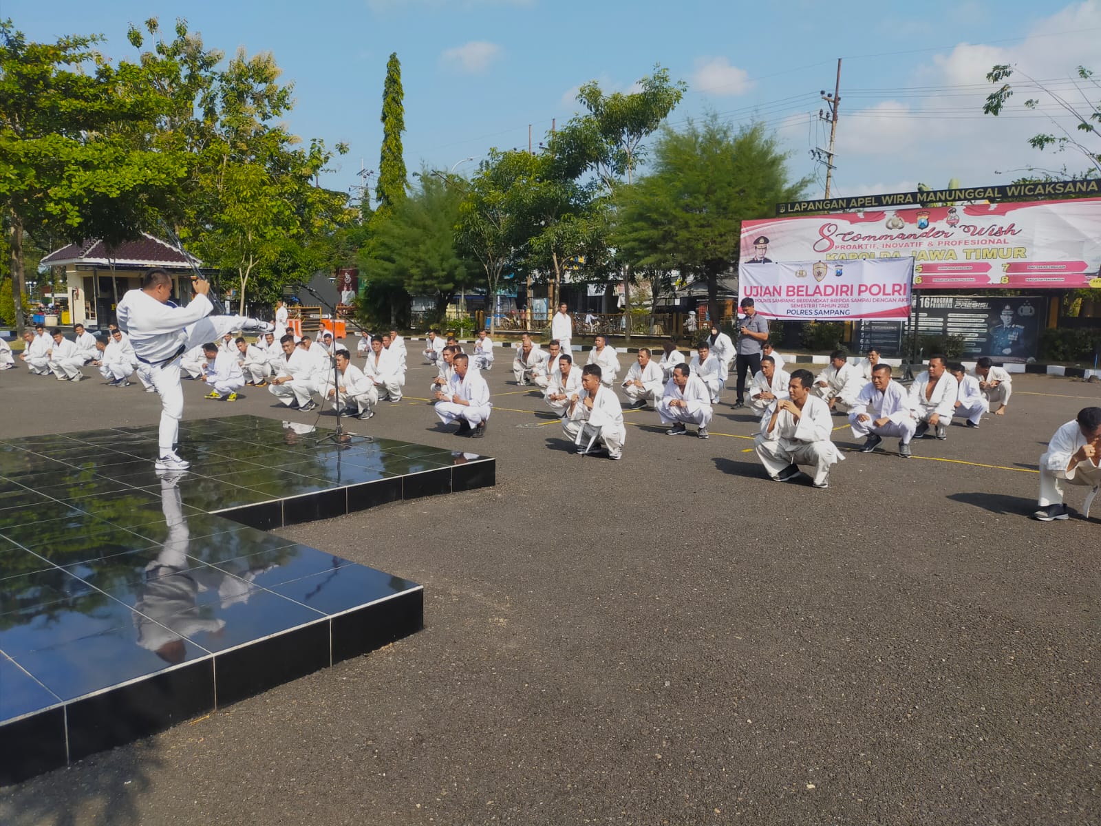 “Ujian beladiri yang dilaksanakan pada hari ini merupakan tindaklanjut perintah Kapolda Jatim yang memerintahkan seluruh jajaran Polda Jatim untuk melaksanakan pelatihan beladiri secara rutin kepada seluruh anggota Polri mulai pangkat Bharada sampai pangkat AKP. Sedangkan di Polres Sampang yang melaksanakan anggota berpangkat Bripda sampai dengan AKP”, tutur Kabag SDM Polres Sampang Kompol Hari Siswo Suwarno SH.