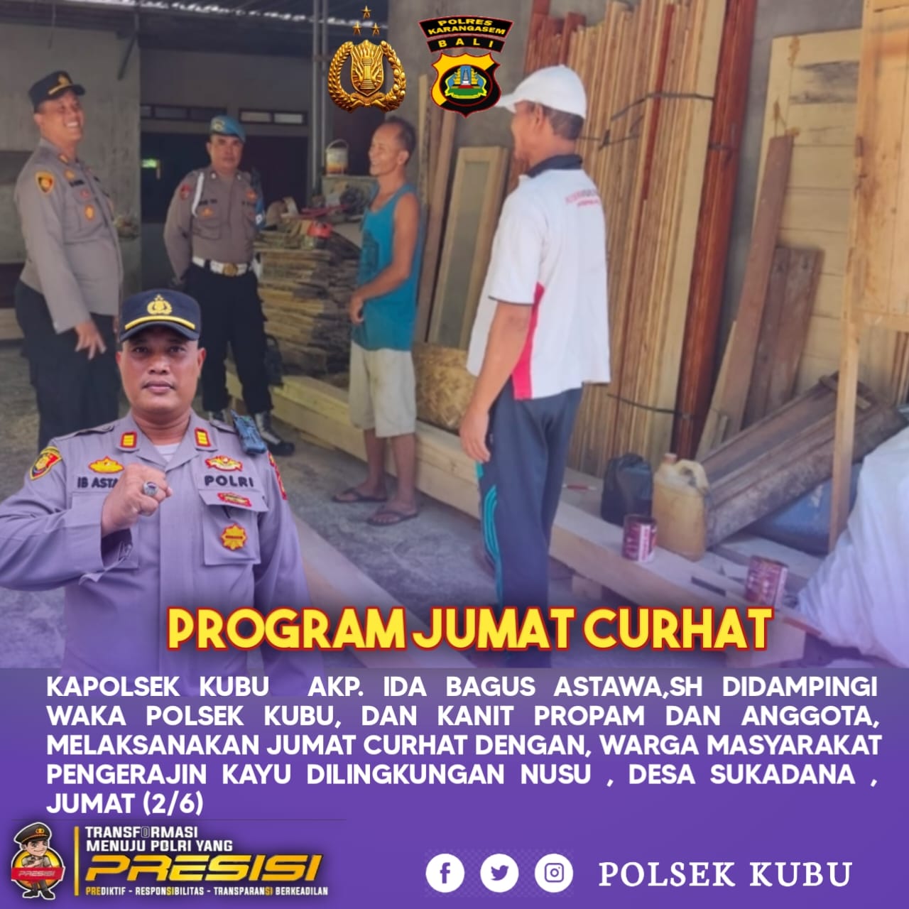 Lebih lanjut Kapolsek Kubu mengatakan kegiatan Jumat Curhat ini merupakan program Kapolri untuk kemajuan Institusi Polri, sekaligus untuk meningkatkan Pelayanan Polri kepada masyarakat, dan hal ini akan terus dilaksanakan .