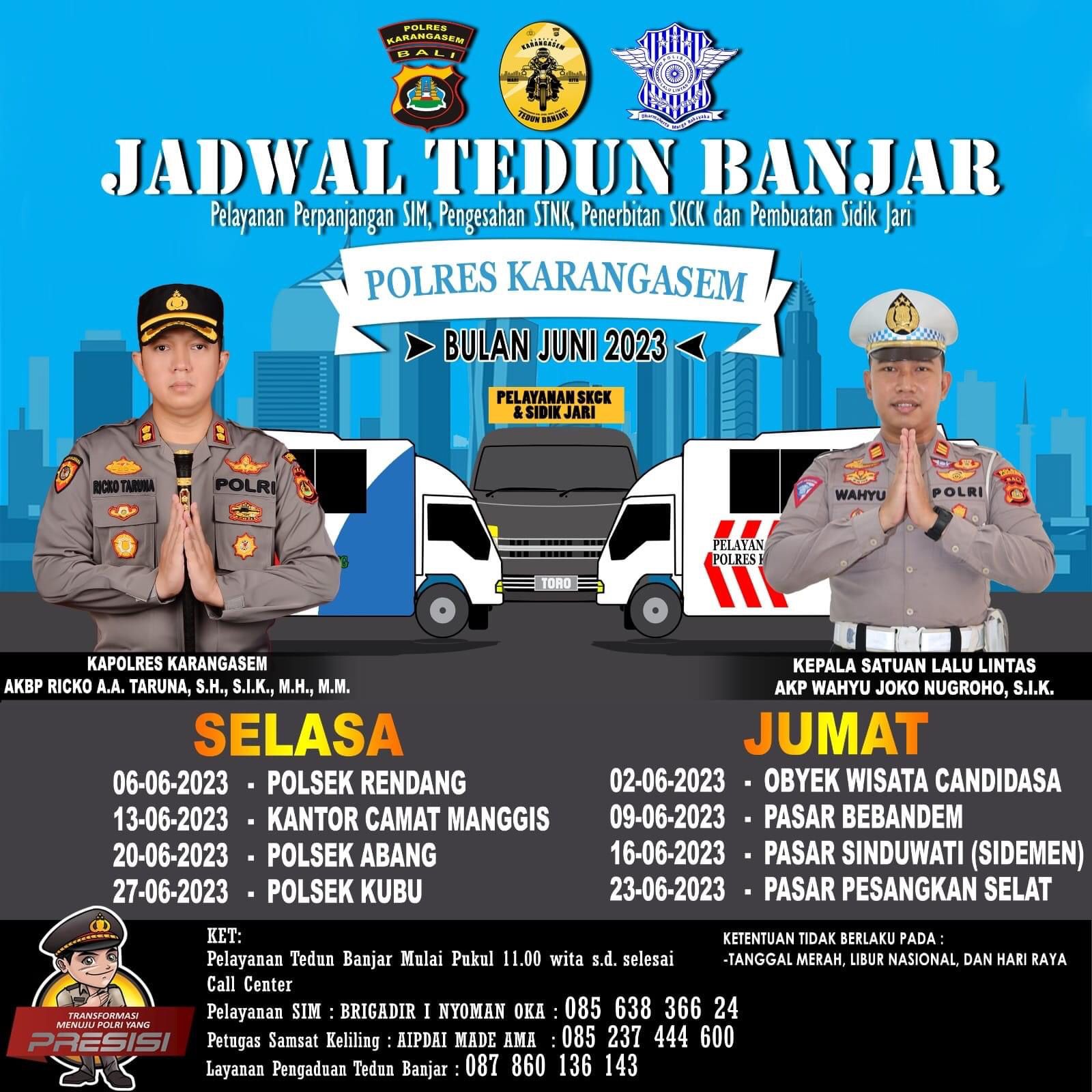 Untuk jadwal di wilayah Kabupaten Karangasem pada hari Selasa tanggal 06-06-2023 di Polsek Rendang, 13-06-2023 di Kantor Camat Manggis, 20-06-2023 di Polsek Abang, 27-06-2023 di Polsek Kubu. Sementara untuk hari Jumat tanggal 02-056-2023 di Obyek Wisata Candidasa, 09-06-2023 di Pasar Bebandem, 16-06-2023 di Pasar Sinduwati (Sidemen), 23-06-2023 di Pasar Pesangkan (Selat).