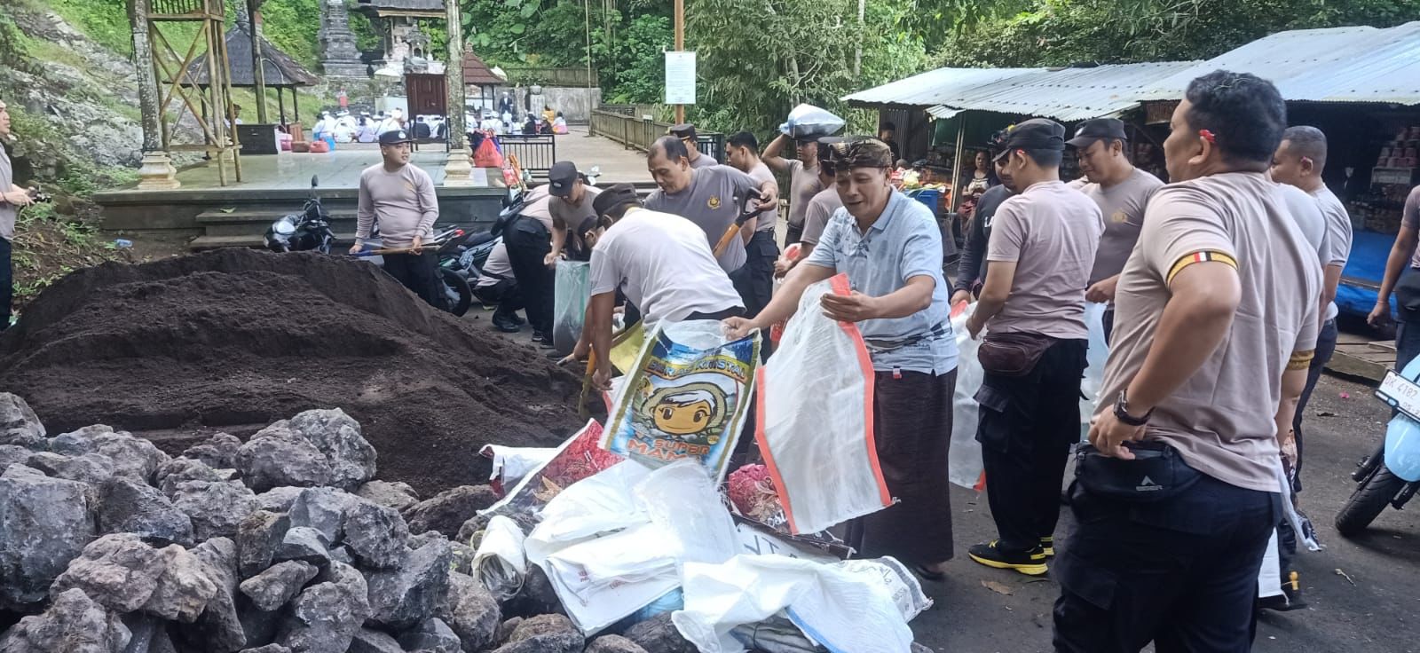 Sebelum kegiatan tersebut dilaksanakan persembahyangan di Pura Telaga Mas dan Apel Kesiapan dipimpin Kabag SDM, Adapun kerja bakti dilaksanaan dgn mengangkut pasir dan batu ke lokasi jalan tangga yang rusak di beberapa titik