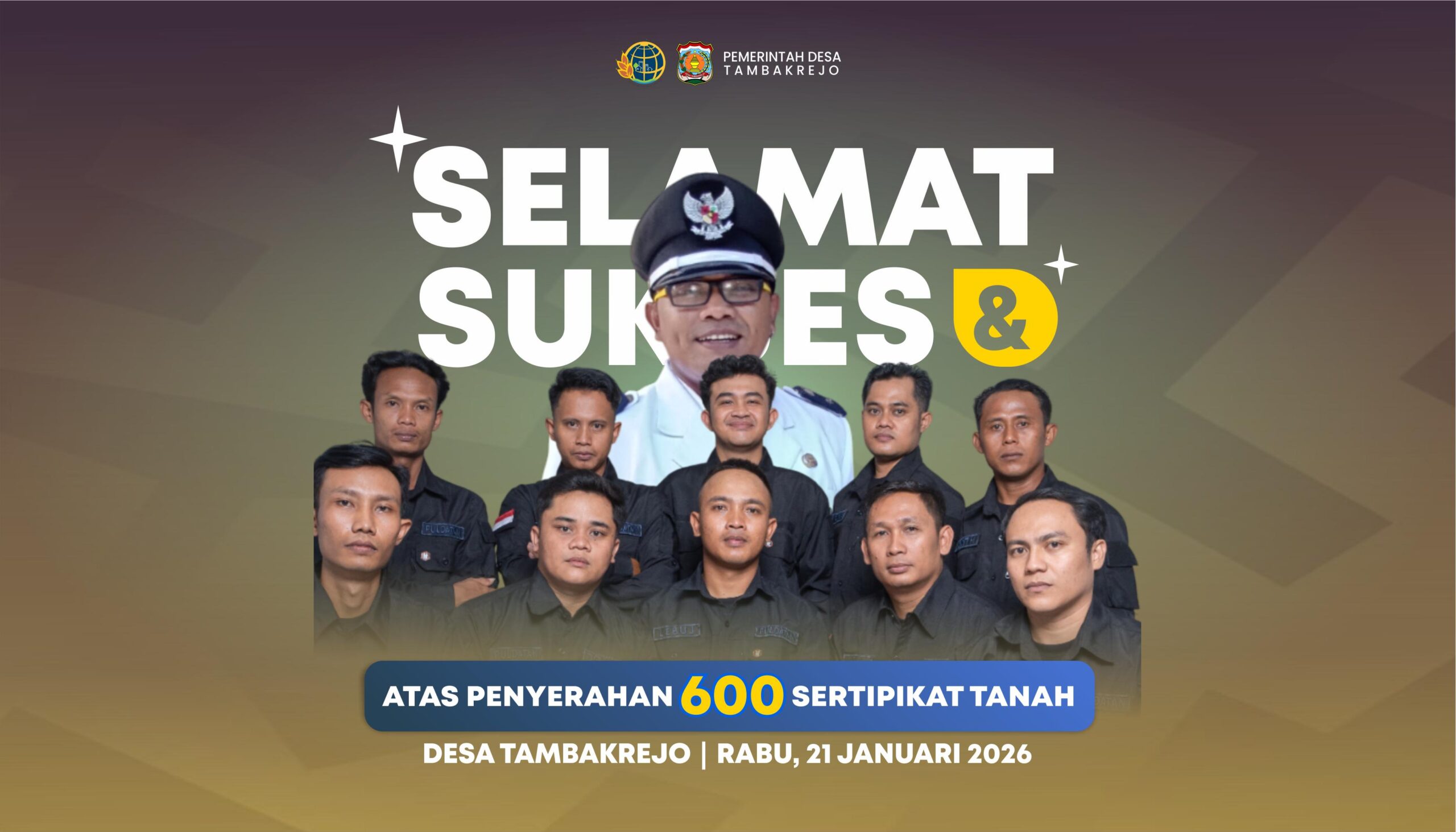 BANYUWANGI, 21 JANUARI 2026 – Sebanyak 600 sertifikat hak atas tanah resmi diserahkan kepada warga Desa Tambakrejo, Banyuwangi, dalam kegiatan Panitia Pendaftaran Tanah Sistematis Lengkap (PTSL), Rabu (21/1). Penyerahan tahap awal ini merupakan bagian dari total 3.800 sertifikat yang akan diterbitkan bagi warga desa tersebut.