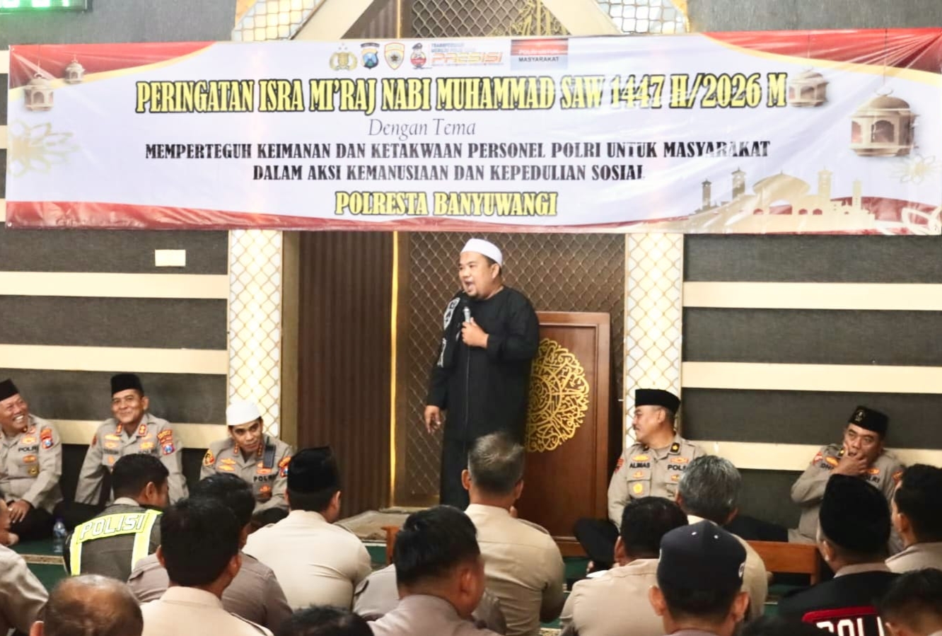 BANYUWANGI, Polresta Banyuwangi menggelar peringatan Isra Mi’raj Nabi Muhammad SAW 1447 Hijriah di Masjid Roudlotul Jannah Polresta Banyuwangi, Kamis (22/1/2026).