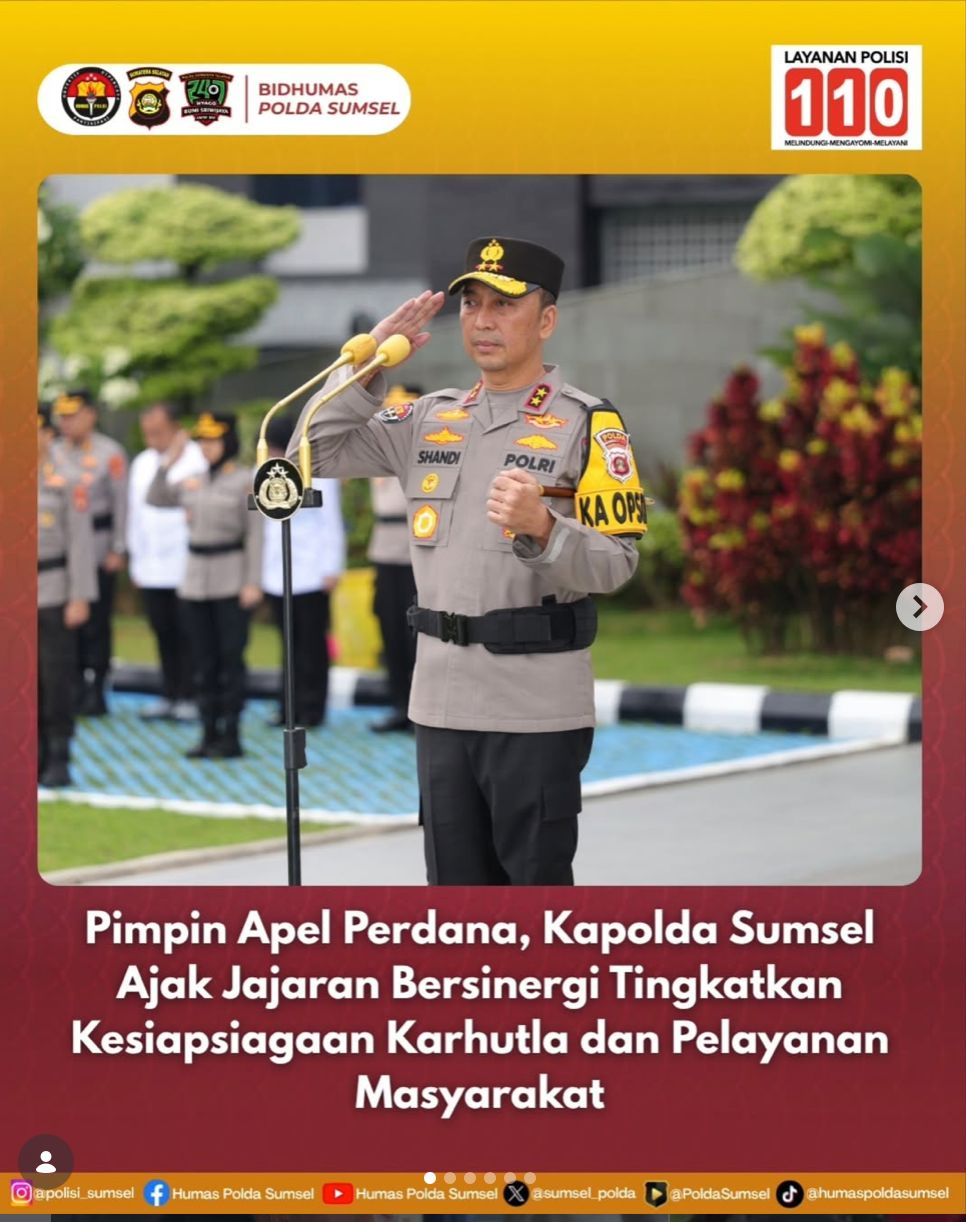 *PALEMBANG, 25 Maret 2026* – Memasuki hari pertama kerja usai cuti bersama Hari Raya Idul Fitri 1447 Hijriah, Kepolisian Daerah (Polda) Sumatera Selatan langsung merapatkan barisan. Mengedepankan semangat melayani dan melindungi masyarakat, Kapolda Sumsel memimpin Apel Pagi sekaligus Halal Bihalal di Halaman Mapolda Sumsel, Rabu (25/3/2026) pagi. Kegiatan yang dimulai pukul 07.00 WIB tersebut turut dihadiri oleh Wakapolda Sumsel Brigjen Pol Rony Samtana, S.I.K., M.T.C.P., Irwasda Kombes Pol Feri Handoko Soenarso, S.H., S.I.K., beserta seluruh jajaran Pejabat Utama (PJU) dan personel Polda Sumsel.
