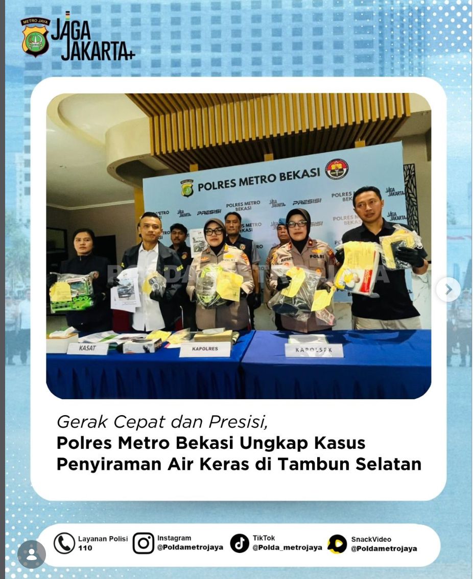 Respons cepat dan kerja profesional ditunjukkan oleh jajaran Polres Metro Bekasi dalam mengungkap kasus penyiraman cairan kimia berbahaya yang terjadi di Tambun Selatan. Dalam waktu singkat, tiga pelaku berhasil diamankan, menegaskan komitmen Polri dalam menjaga keamanan serta melindungi masyarakat dari tindak kekerasan.