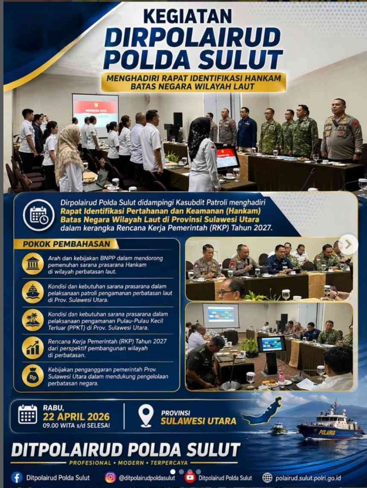 Dirpolairud Polda Sulut secara resmi menghadiri rapat identifikasi pertahanan dan keamanan batas laut di wilayah Sulawesi Utara. Pertemuan strategis ini dilangsungkan pada Rabu, 22 April 2026, dengan pendampingan langsung dari Kasubdit Patroli. Seluruh rangkaian kegiatan dimulai sejak pukul 09.00 WITA guna membahas langkah-langkah krusial dalam pengamanan perairan negara.